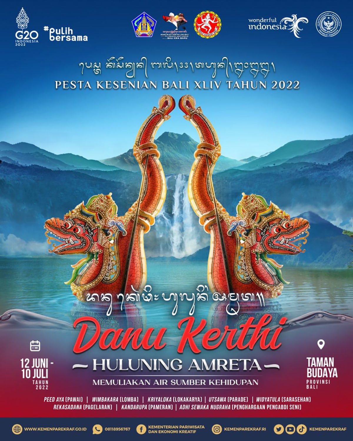 Oh iya, PKB juga termasuk salah satu event seni yang udah rutin diadakan sejak 1978. Tahun 2022 ini merupakan penyelenggaraan yang ke-44 dan tema yang diusung adalah “Danu Kerthi: Huluning Amreta (Memuliakan Air Sumber Kehidupan)”. Nah, tema tersebut bakal dieksplorasi oleh para seniman buat menghasilkan karya yang memamerkan potensi, ciri khas, maupun keunikan tradisi dari berbagai daerah di Bali.